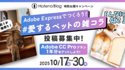 Information #愛するペットの雑コラ とエピソードをブログに書いてAdobe Creative Cloud Pro 1年分が当たるキャンペーンに応募しよう オールインワンなデザインアプリ、Adobe Expressとのコラボキャンペーンです。素敵な記事を書いて1年分のAdobe Creative Cloud Proをゲットしよう! 2025.10.17 InformationSponsored OdaiSpotlight