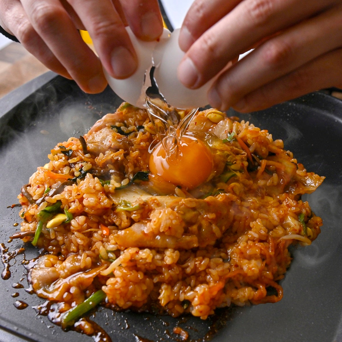 ヤンニョム×チーズの旨辛な味わいがたまらない、絶品ビビンバ。 鉄板の上で作る出来立てアツアツを召し上がれ!
