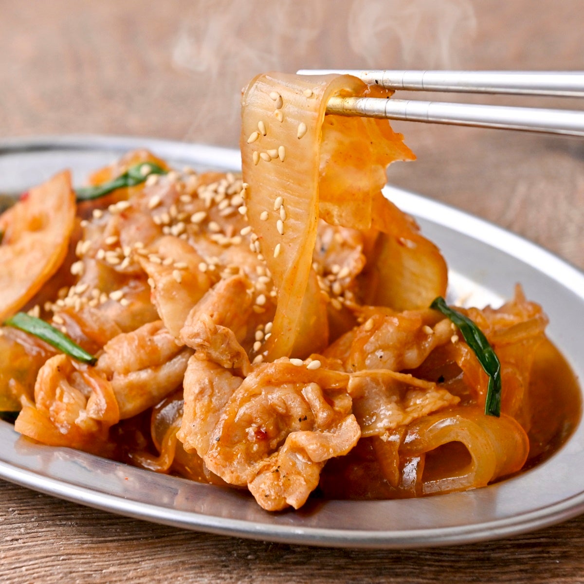 驚きのツルツルもちもち食感の極太春雨「タンミョン」!甘辛いタレと豚肉の旨みシミシミ。