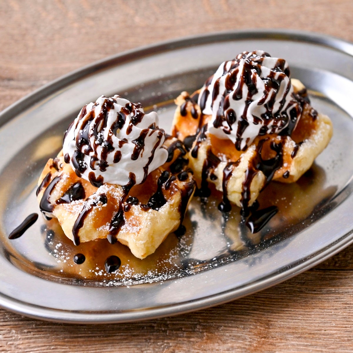 ふわっふわのワッフルに、定番のホイップクリームと甘~いチョコレートソースをトッピング!