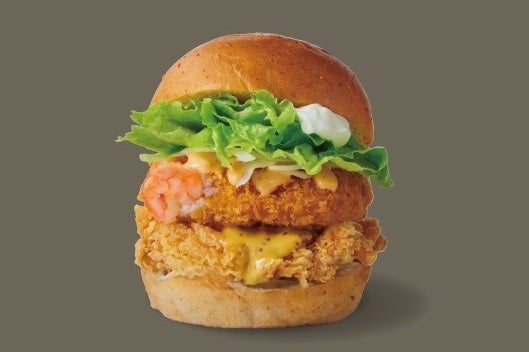 衣は薄めに、低温でじっくりと揚げることで、外はサクッと香ばしく、中は驚きのプリプリ食感に。エビのうま味が口いっぱいに広がる「えびかつ」と、国産鶏ささみ肉を使用した「チキンフィンガー」を一緒にサンドした『えびかつチキンバーガー』(690円税込)は、昨年多くのお客様から「また食べたい!」と大好評をいただいた人気メニューです。