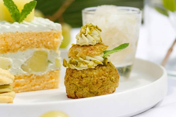 「ミントとメロンのショートケーキ」は、ミントの香りを移したシロップを打った生地に、こちらもフレッシュのミントをふんだんに使用し香りを移したミントクリームでメロンをサンドしたショートケーキ。クリームをミント風味にすることで、しっかりとした味わいでありながらも軽く食べられる一品となっている。