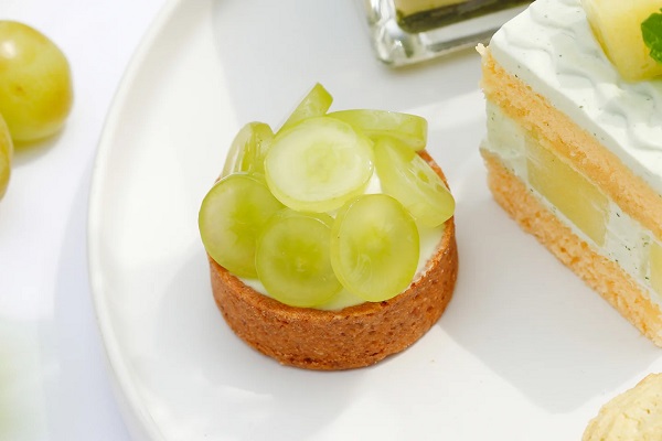「マスカットタルト」は、香ばしいアーモンドのタルトにマスカット風味のチーズクリームとフレッシュマスカットを合わせたメニュー。クリームにチーズを使用することで、酸味と濃厚さをプラスしている。