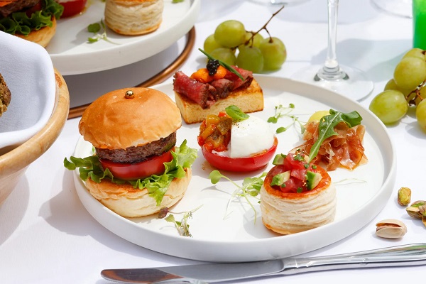 セイボリーは、(下段の中央、最上部から時計回りで)「イタリア直送モッツァレラを使ったカプレーゼ」「USDA PRIME BEEFとウニ、キャビアのオープンサンド」のほか、メロンの甘味と生ハムの塩気のバランスが絶妙な「生ハムメロン」、見た目も鮮やかな「マグロのタルタルパイ」、不動の人気を誇るジューシーなUSDAプライムビーフが味わえる「USDA PRIME BEEFのミニハンバーガー」が提供される。