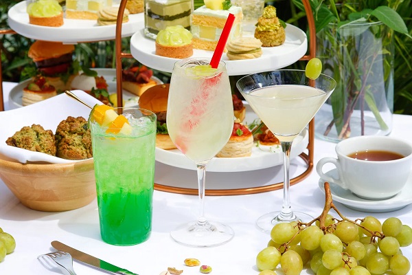 新緑アフタヌーンティー(全12種)の料金は、1人平日7,800円/土日祝8,800円(税・サ料込)、カクテル1杯セットは平日8,800円/土日祝9,800円(税・サ料込)で、シャンパン、モクテルも楽しむことができる。