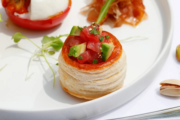 「マグロのタルタルパイ」は、サクサクのパイ生地に、フレッシュなマグロとアボカドを彩り豊かにトッピングしたメニュー。金箔を添えた華やかな前菜は、味わいと見た目の両方で魅了する。