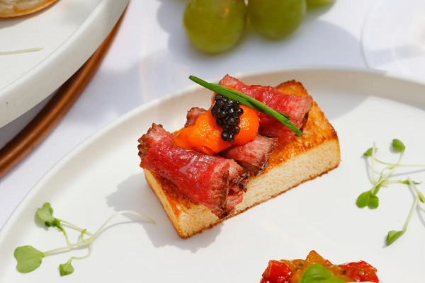 「USDA PRIME BEEFとウニ、キャビアのオープンサンド」は、軽い食感のブリオッシュに「IL LUPINO PRIME」自慢のUSDAプライムビーフとウニ、キャビアを乗せ贅沢に仕上げている。