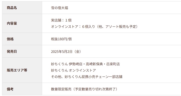 「雪の宿大福」の価格は1個/180円(税別)で、妙ちくりん伊勢崎店・高崎新保店・邑楽町店、妙ちくりん提携小売チェーン一部店舗、および妙ちくりんオンラインストアにて販売中。
