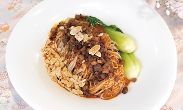 「汁なし担々オーツ麺」¥1,298(税込)は、黒麦をブレンドしたオーツ麺を汁なし担々麺風に調理した「蘭苑」オリジナルの創作中華。豊富な食物繊維、低GIのヘルシー麺に山椒油のピリ辛の風味とオイスターソースのうまみが効いた逸品となっている。