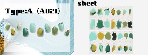 「B021 2D」はType:Bのみで、長さカットせず使いやすいType:Bの特徴を生かした2Dに見えるだまし絵的なネイル。さわやかさと落ち着きのあるカラーのトーンを合わせてまとまりのある配色になっている。