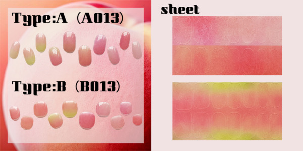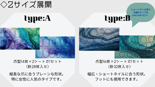同商品はシール2シート入りで、「Type:A(爪形28枚)」「Type:B(爪形32枚)」を展開。ウッドスティックやヤスリなどは付属しない。