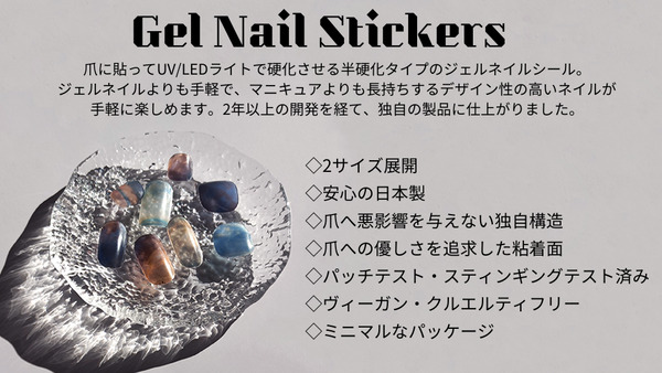 「Gel Nail Stickers」1980円(税込)(※)は、爪に貼ってネイル用UV/LEDライトで硬化させることで、爪にフィットし長持ちするジェルネイルシール。爪と環境への優しさを追求し、企画から製造・梱包に至るまで日本製の商品だ。独自構造・ネイルケア成分配合の医療用粘着などのアプローチで爪に優しく、ミニマルなパッケージ・製造工程によるごみの減量などエシカルな取り組みが詰まっている。また、ヴィーガンの人も利用できる、クルエルティフリーな商品となっている。