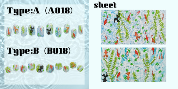 「018 Goldfish」は、爪すべてで金魚鉢をつくったような、透明感のあるデザイン。自由に泳ぐ金魚を波紋と水草で表現している。