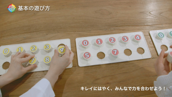 ピースを裏返す時と、プレートにピースをはめる時は、誰でも自由にピースを触れてOK。そのため、自分が運ばなければならない色のピースの事だけでなく、チームの一員としてどのように動くかがスピードアップのカギとなる。