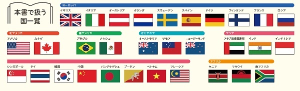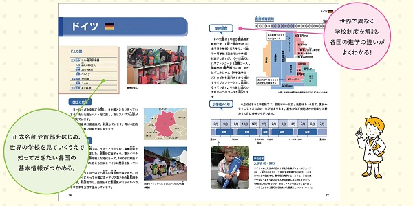 扱っている国は、ヨーロッパ・北アメリカ・南アメリカ・オセアニア・アジア・アフリカの31か国にのぼる。各国のページには、学校行事、学校制度、実際の授業風景など学校生活の一日、通学、特徴的な科目などに加えて、スクールバスやカバンの紹介、さらには気候や日本との関係性、その国の特徴的なお祭りなどの項目も設けており、小中学生の調べ学習の参考図書としても最適だ。