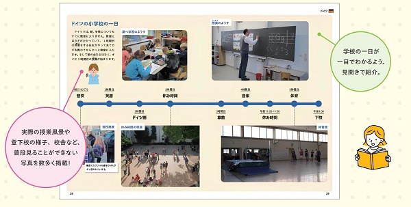 「各国の学校の一日」では、各国の学校の一日を俯瞰してながめられ、全体像がすぐにわかるようになっており、日本の小学校の一日との比較がしやすくなっている。実際の授業風景や登下校の様子、校舎など普段見ることができない写真を多く掲載している。