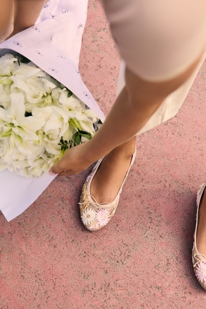 やさしいベージュにピンクや白の花々がふんわりと咲く、ロマンティックなデザインが足元を華やかに彩り、履くだけで心がふわっと明るくなるような一足に。