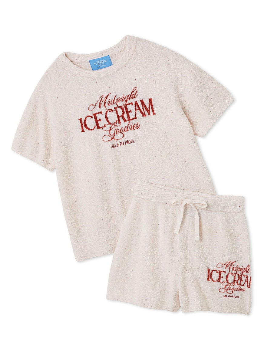 なめらかな‘スムーズィー’素材を使用したニットシリーズ。グラフィカルなメッセージロゴをジャガードで施し、ホワイトはカラースプレーを、ピンクはイチゴの粒感をイメージしたネップでアイスクリームを表現しています。