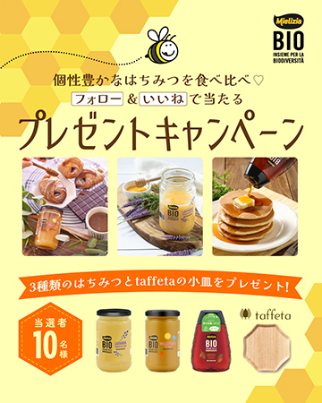 送付予定の賞品は、「MIELIZIA」イタリア産有機百花ハチミツ400gx1、有機ラベンダーハチミツ400gx1、イタリア産森の有機ハチミツ(スクイーザーボトル)250gx1、「taffeta」八角小皿x1。当選者10名には、Instagramのダイレクトメッセージにて当選連絡が届く。