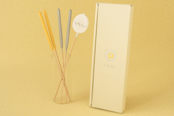 卵殻(炭酸カルシウム)×金属(チタン)の「棒状花火(オレンジ)」は、卵の殻とキラキラ光るチタンの粉が出会い、あたたかいオレンジ色と透き通った光が一緒に輝く。パチパチ、優しい音も聞こえてくる。