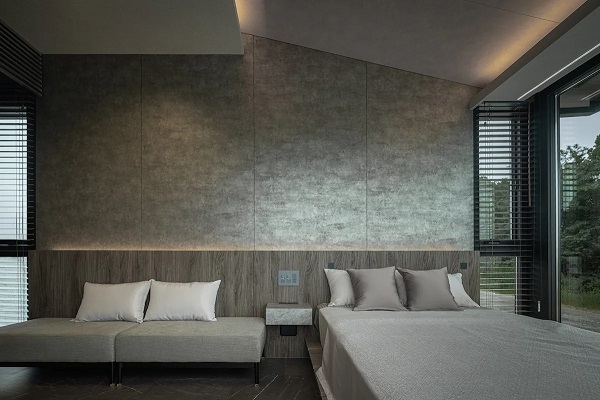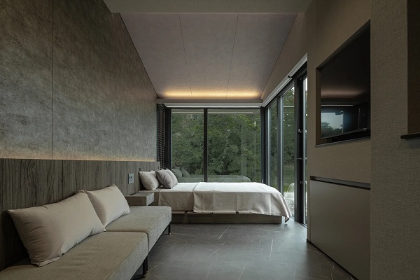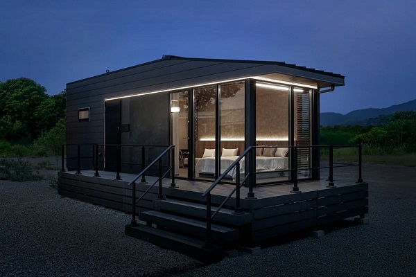 「OURTH for STAY」は、勾配屋根が印象的な外観。市街化調整区域や遊休地でも設置できる。大人3名まで快適に過ごせる設計となっており、室内は柔らかな間接照明が上質感を演出する。