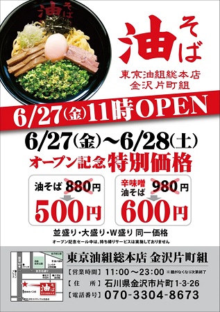 「東京油組総本店」は、石川県での出店を記念し、6月27日(金)・28日(土)の2日間、「油そば」と「辛味噌油そば」を特別価格で提供!「油そば」880円(税込)が500円(税込)、「辛味噌油そば」980円(税込)が600円(税込)になる。並盛り・大盛り・W盛り全て同一価格。店内飲食のみ適用で、テイクアウトは不可だ。
