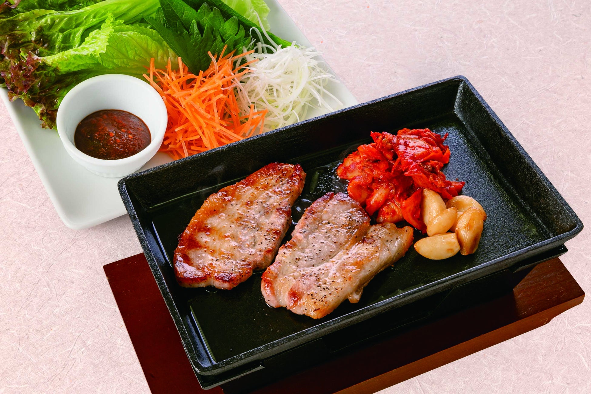 厚切りの豚バラ肉を卓上鉄板に載せました。お好みの大きさにお肉をカットしてキムチ、サムジャン、野菜と一緒にお召し上がりください。
