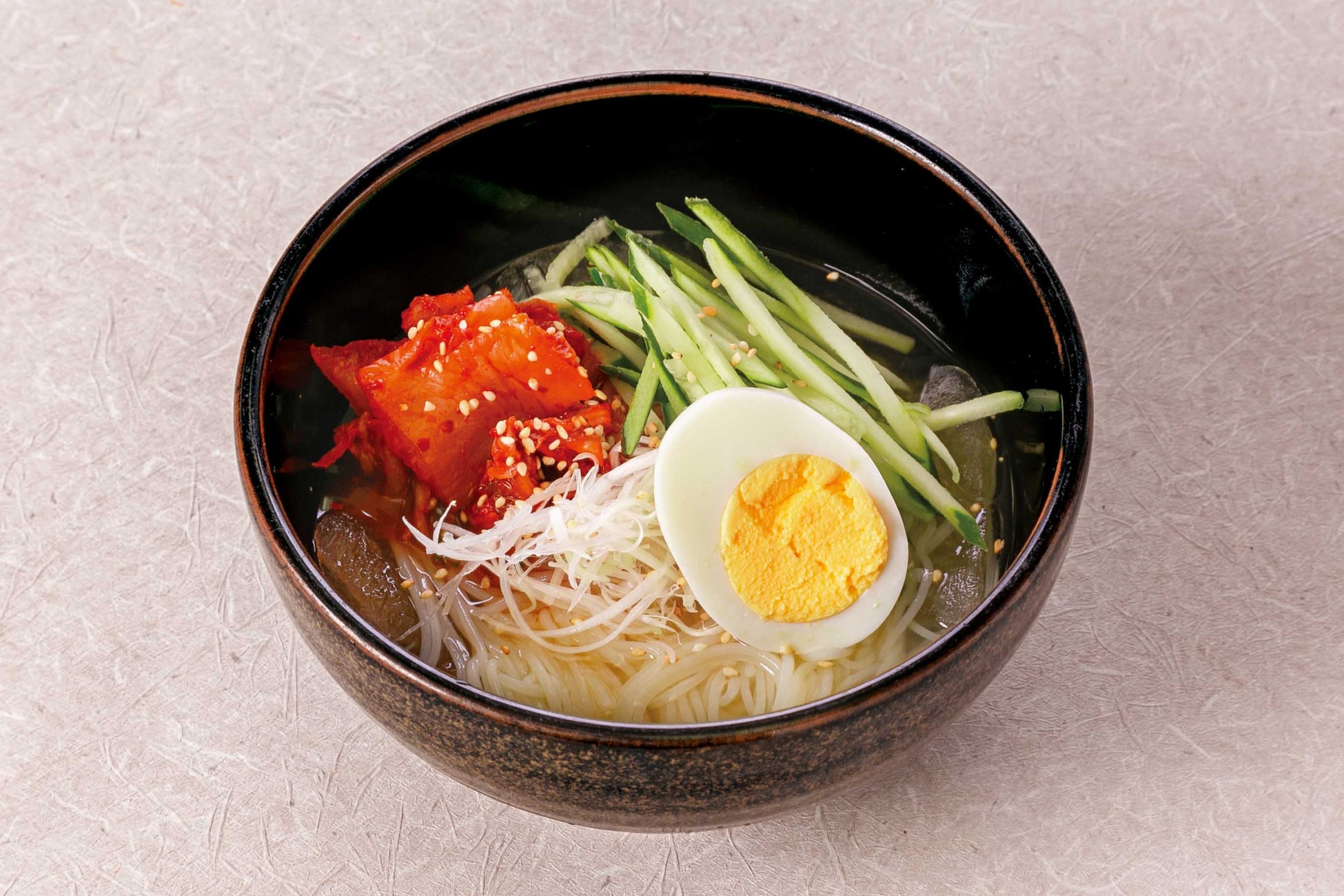 大阪鶴橋コリアタウンに1948 年創業。ずっと、もっと、韓国の味。大阪・鶴橋 徳山物産 監修メニューです。独自の食感・風味を引き出す押出製法にこだわった本格韓国冷麺です。飲んだ後の〆にもオススメです。