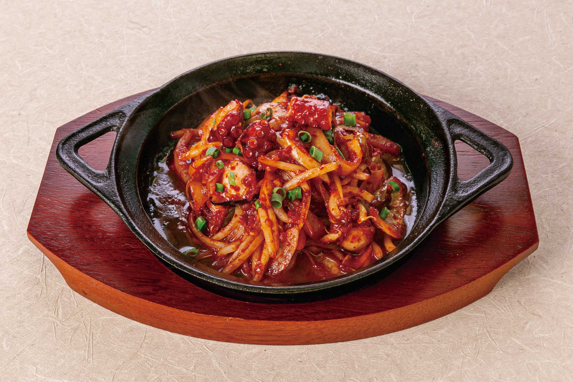 韓国のイイダコをピリ辛に炒めたチュクミポックムを吾平風にアレンジ。韓国風に炒めたタコをお楽しみください。