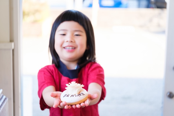 研修後は、保護者を「お客様」として迎え、席への案内、オーダー、ドーナツのデコレーション、ドリンク提供、お会計までを子どもたちが担当。もちろん、写真撮影も楽しめる。