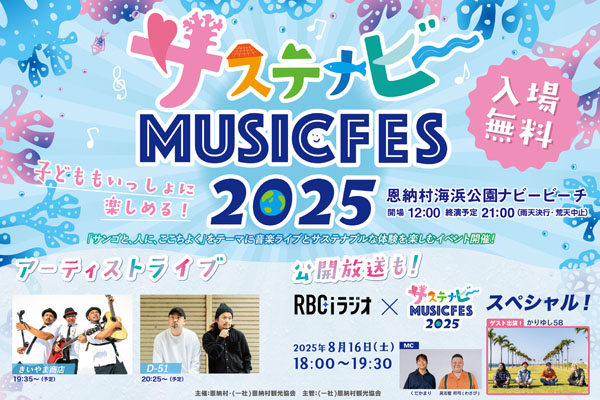 「サステナビーMUSICFES」は、「世界一サンゴと人にやさしい村」を目指すまちづくりの一環として2024年に初開催された。このイベントでは、サステナブルな音楽・体験・食を通じて、SDGs未来都市・恩納村が推進する環境・文化・社会にやさしい取り組みや村の魅力を「感じて」「考える」きっかけをつくる。