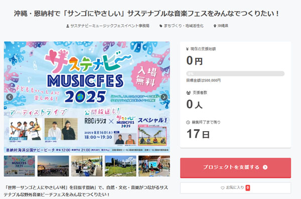 沖縄県恩納村では、今年もサステナブルな音楽イベント「サステナビーMUSICFES 2025」を、8月16日(土)に恩納村海浜公園 ナビービーチにて開催するにあたり、イベント自走化に向けてクラウドファンディングに挑戦している。