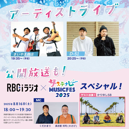 18:00〜19:30には、RBCiラジオによる公開生放送も実施。MCはくだかまりさんと具志堅将司さんが担当、ゲストに「かりゆし58」が登場する。会場に足を運べない人も、イベントの雰囲気をラジオを通じて楽しめる。