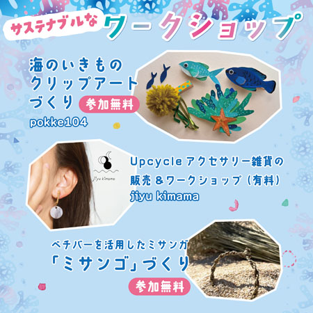 ワークショップでは、親子で楽しみながら一緒にサステナブルやSDGsについて学ぶことができる。pokke104さんによる「海のいきものクリップアートづくり」は無料で参加可能。jiyu kimamaさんは、Upcycleアクセサリー雑貨の販売と「海洋プラスチックワークショップ」(有料)を実施。サンゴを守る植物「ベチバー」を活用した「ミサンゴ」づくりも無料で行われる。