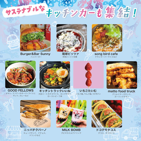 そのほか、地元のキッチンカーがフードロス削減&地産地消で大集合し、「サンゴと、人に、ここちよく。」をテーマに、美味しくやさしい食を提供する。