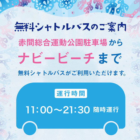当日は、恩納村海浜公園の駐車場は利用不可。赤間総合運動公園が臨時駐車場となる。11時~21時半の間は、赤間総合運動公園駐車場からナビービーチまで無料シャトルバスを運行している。イベントは12時開場し、21時終演。