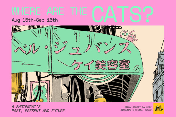 渋谷区・神宮前二丁目のJinny Street Galleryでは、8月15日(金)~9月15日(月)の期間、アーティスト・KITTYZILLA(キティジラー)氏による絵画展「Where are the Cats?/猫たちはどこへ消えた? 商店街の過去・現在・未来(以下、猫たちはどこへ消えた?)」を開催する。