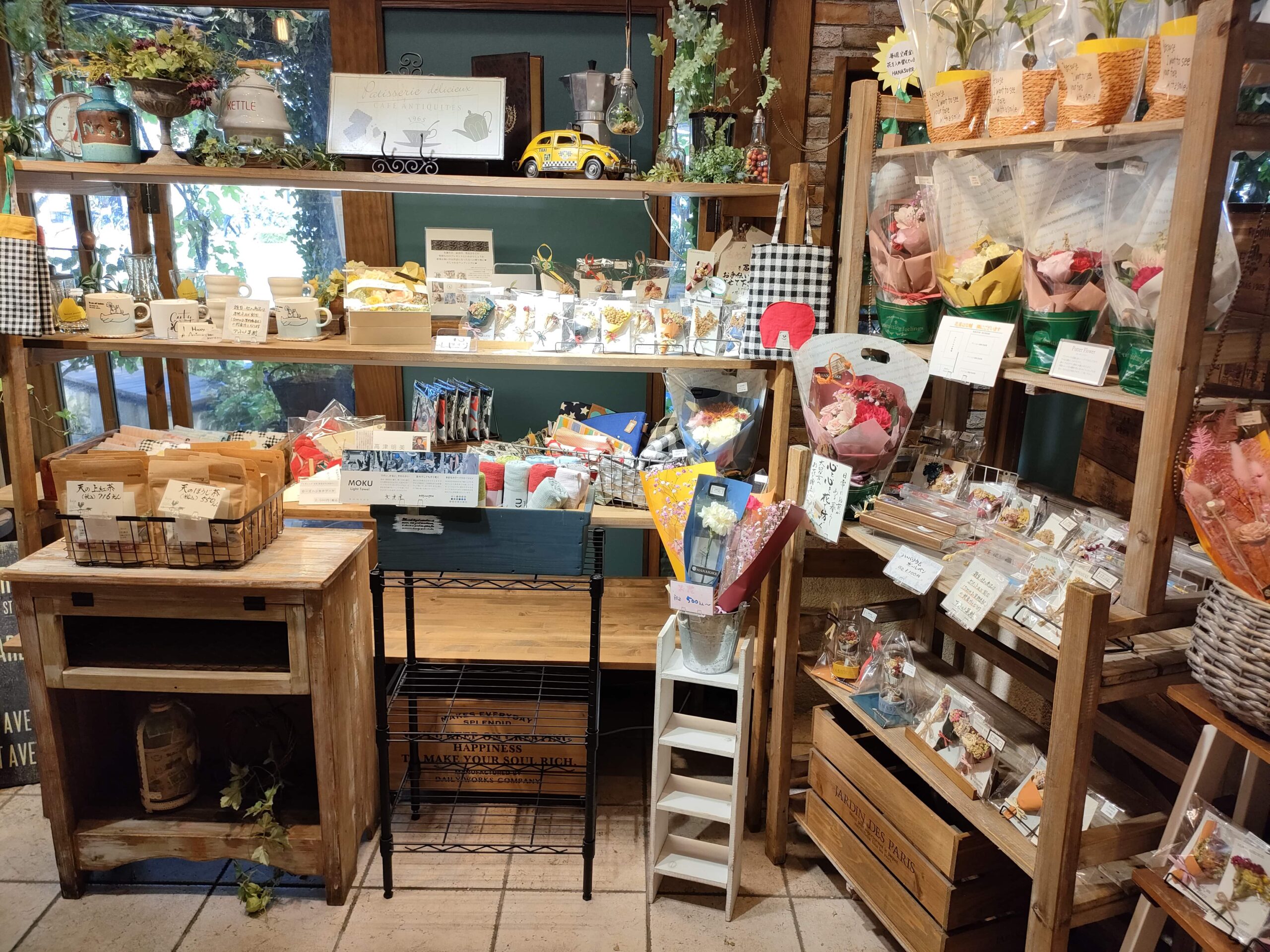 ドライフラワーやコップ、ハンカチなどの雑貨が販売されています。