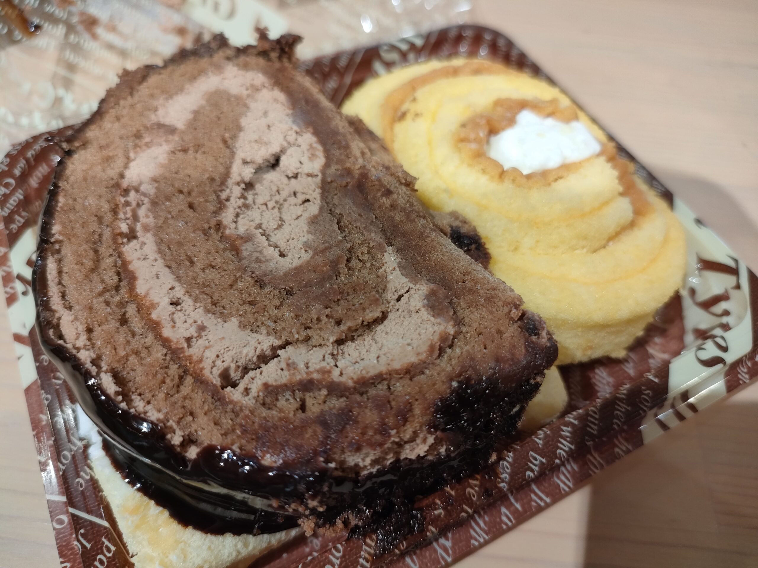 ショコラロールやロールケーキの端が入った、おやつロール。