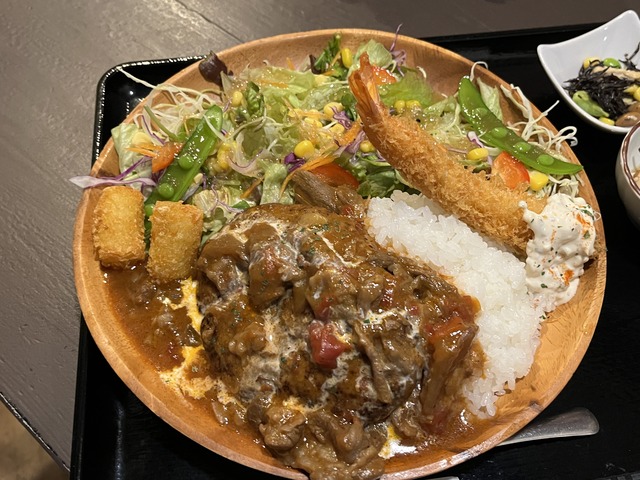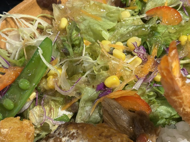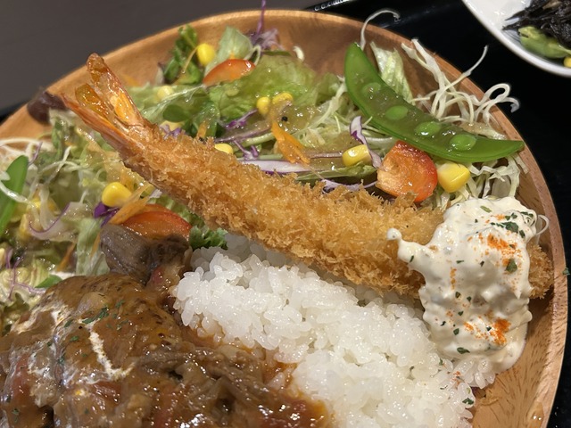 ハンバーグにライス、サラダにポテトなしっかりボリュームのプレート♪