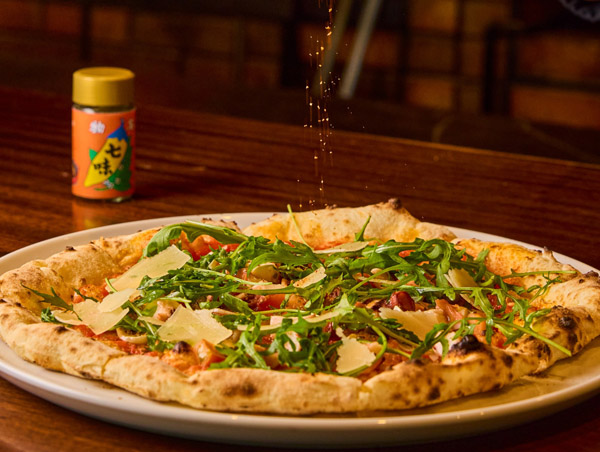 「ピッツァ・マリナーラ 蛸 タジャスカオリーブ トマト オリジナル七味添え」は、イタリアの伝統的なピッツァ・マリナーラをベースに、旨味豊かな蛸とコクのあるタジャスカオリーブをトッピング。トマトの酸味と甘みに、七味唐辛子を添えて、香ばしさとほどよい辛味がプラス。素材の持ち味を生かしたシンプルなトマトベースのピッツァに、七味のスパイスが程よいアクセントを添えた一枚。料金は、Ssize(20cm)が2,500円、Msize(28cm)が3,400円(ともに税・サ込)、提供期間は9月末まで。