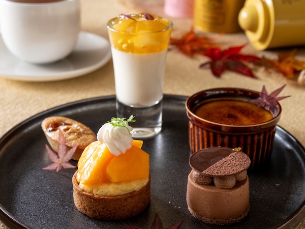 スイーツのプレートには、グラスに入った洋梨のブランマンジェや南瓜のブリュレ、柿のタルトレットなど、旬の素材を使ったスイーツが並ぶ。