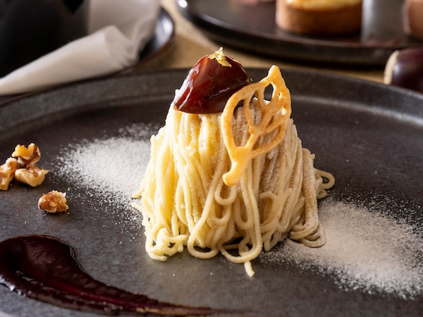 最後に登場するのは、シェフの特別メニュー「和栗とさつまいものモンブラン カシスソース」。サクサクとした食感のメレンゲにキャラメルのアイスクリームやシャンティがのっており、和栗とさつまいもで作った2色のクリームをたっぷりと絞っている。