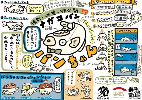 今回、連携プロジェクトの一つとして、魚津水族館で展示されているコバンザメ科ナガコバンのバンちゃんをキャラクターとしてイラスト化。バンちゃんを通じて、「寿司ネタ見るなら、魚津水族館」を全国にPRしていきたいと考えている。