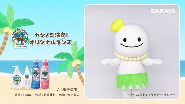 対象動画では、かつて「ヤシノミ洗剤」のCMにも使用された名曲『椰子の実』をポップにアレンジした楽曲と、「バブリーダンス」や「アバンギャルディ」の振付で有名なakane先生の楽しい振付で、親しみやすいオリジナルダンスが楽しめる。「ヤシノミ洗剤」のオリジナルキャラクター「ヤシボー」の可愛らしいダンスにも注目してみて。