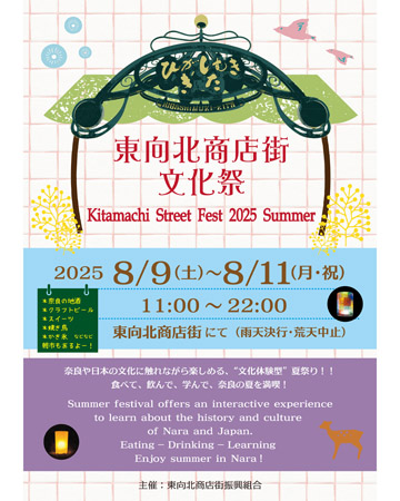 奈良県・近鉄奈良駅前北側の“きたまち”にある「東向北商店街」にて、「東向北商店街夏の文化祭」が8月9日(土)〜11日(月)の各日11時~22時に開催される。