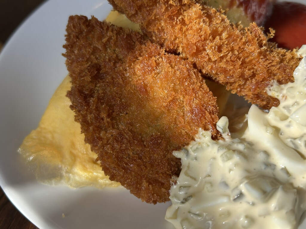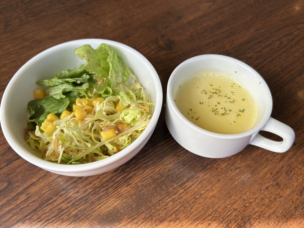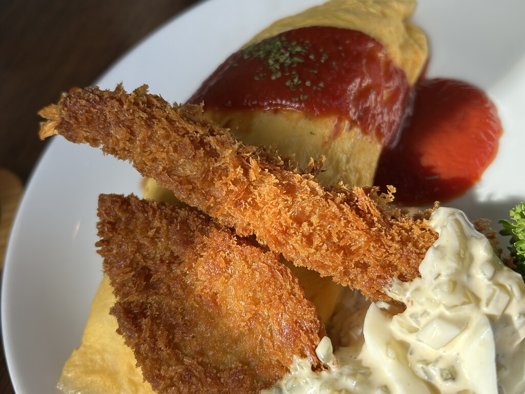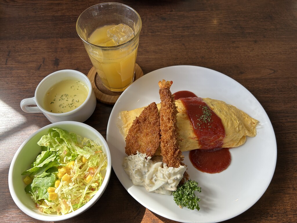 オムrジスと揚げ物のプレートとサラダ、スープ付きです♪