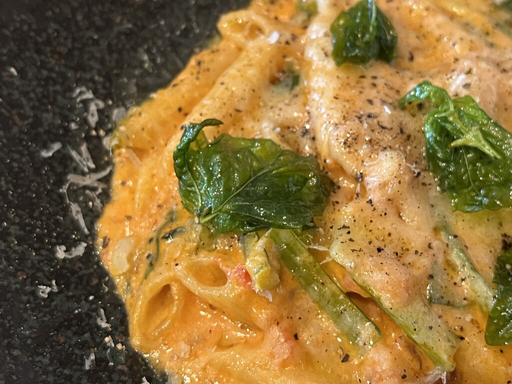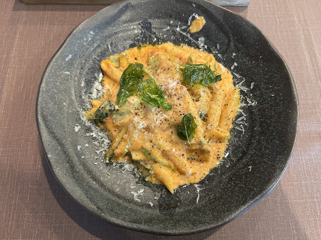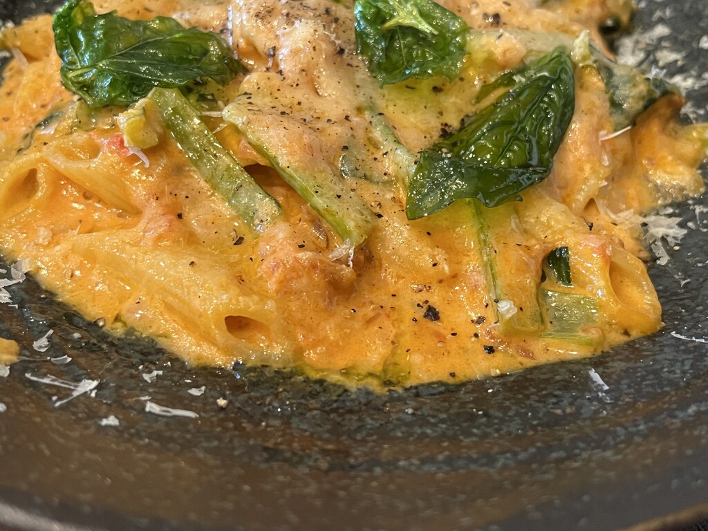 アルデンテに茹でられたペンネと小松菜の食感♪