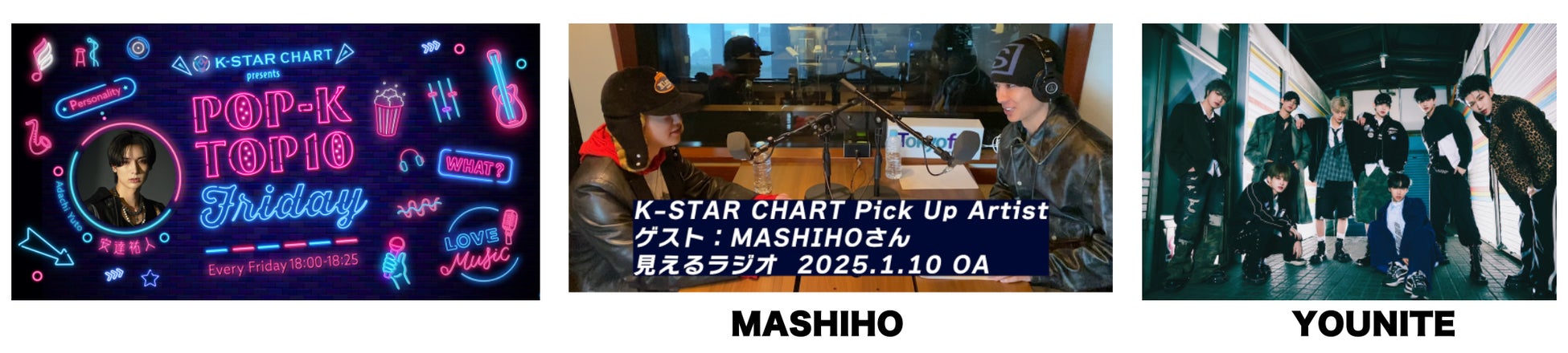 TOKYO FMで放送中のK-POP アイドルのオリジナル・チャートをカウントダウン形式でお届けする『K-STAR CHART presents POP-K TOP10 Friday』(毎週金曜18:00-18:25 放送)は、PENTAGONのユウトとしてもお馴染みの安達祐人がパーソナリティを務める音楽番組。このたび番組コーナー「Pick up Artist」に登場したゲストトークやアフタートークの収録模様の動画配信がスタート!第1弾は元TREASUREで現在ソロとして活躍しているMASHIHO(2025年1月10日OA)が、第2弾は8人組ボーイズグループ・YOUNITE(1月24日OA)が出演時の模様を配信します。音だけでなくアーティストの表情や動きなども楽しめる動画配信も、ラジオと合わせてお楽しみください!