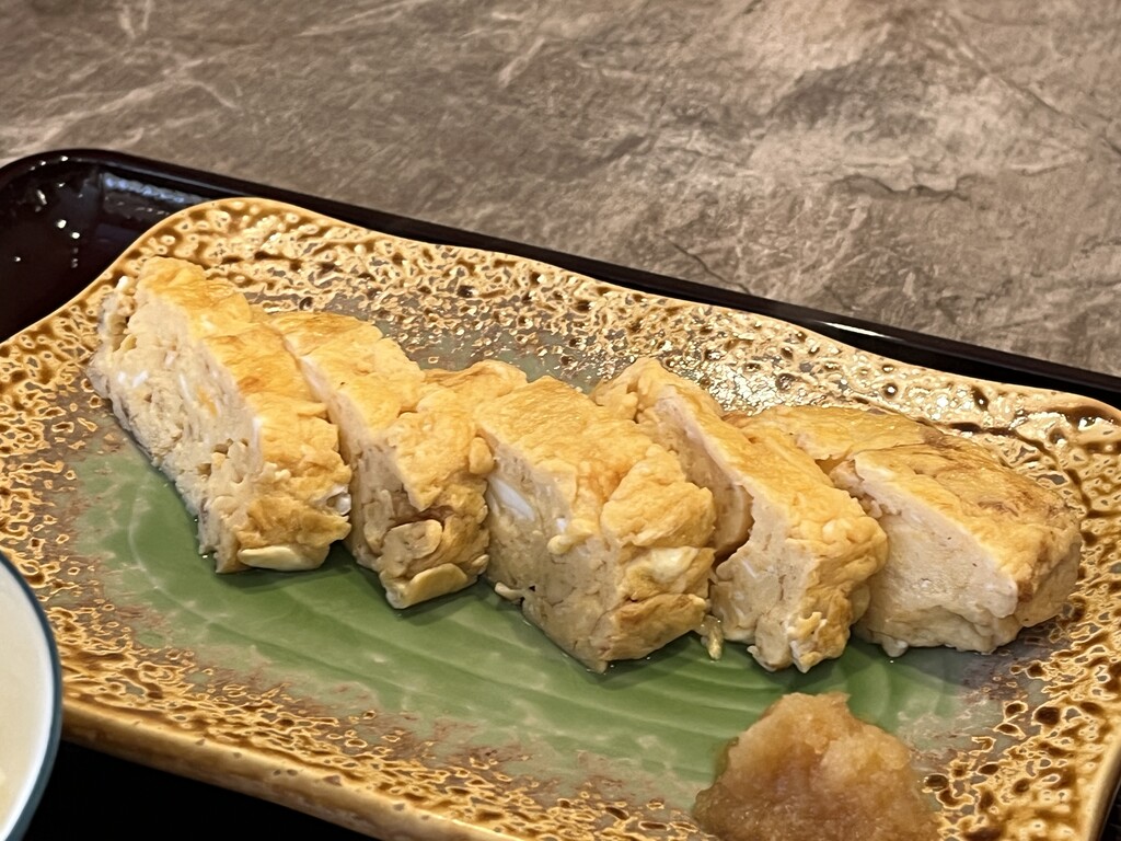 だし巻き、小鉢、お味噌汁、ごはん、香の物の定食♪